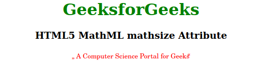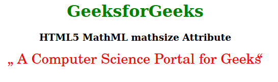 <!DOCTYPE html><html> <body style="text-align:center;"> <h1 style="color:green"> GeeksforGeeks </h1> <h3>HTML5 MathML mathsize Attribute</h3> <math> <ms lquote="„" rquote=" “" mathcolor="Red" mathsize="28px"> A Computer Science Portal for Geeks </ms> </math></body> </html> |