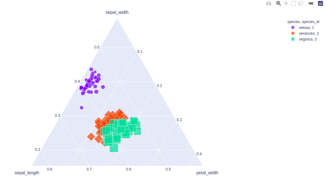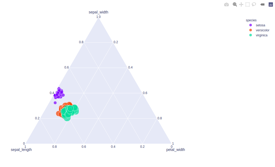 import plotly.express as px df = px.data.iris() plot = px.scatter_ternary(df, a = "sepal_width", b = "sepal_length", c = "petal_width")plot.show() |