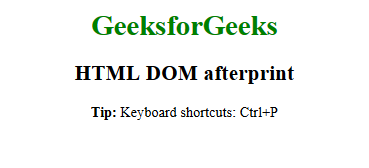 <!DOCTYPE html> < html > < head > < title > HTML | DOM onafterprint Event </ title > </ head > < body > < center > < h1 style = "color:green" > GeeksforGeeks </ h1 > < h2 >DOM onafterprint Event</ h2 > < p > < strong >Tip: </ strong >Keyboard shortcuts Ctrl+P </ p > < script > window.addEventListener("afterprint", myGeeks); function myGeeks() { alert("Document Printed"); } </ script > </ center > </ body > </ html > |