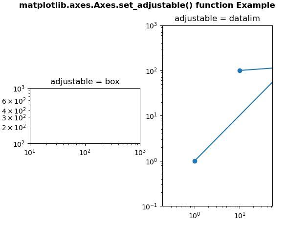 # ImpleIn Reviewtation of matplotlib function import matplotlib.pyplot as plt fig, (ax1, ax2) = plt.subplots(1, 2)ax1.set_xscale("log")ax1.set_yscale("log")ax1.set_xlim(1e1, 1e3)ax1.set_ylim(1e2, 1e3)ax1.set_aspect(1)ax1.set_title("adjustable = box") ax2.set_xscale("log")ax2.set_yscale("log")ax2.set_adjustable("datalim")ax2.plot([1, 113, 10], [1, 119, 100], "o-")ax2.set_xlim(1e-1, 1e2)ax2.set_ylim(1e-1, 1e3)ax2.set_aspect(1)ax2.set_title("adjustable = datalim") fig.suptitle("matplotlib.axes.Axes.set_adjustable() function Example