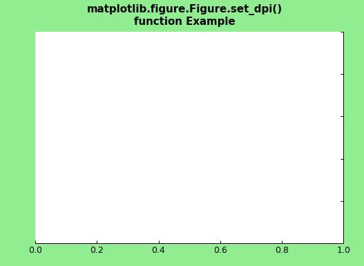 # Implementation of matplotlib function import matplotlib.pyplot as plt from matplotlib.figure import Figurefrom mpl_toolkits.axisartist.axislines import Subplot import numpy as np fig = plt.figure(facecolor ="lightgreen") ax = Subplot(fig, 111) fig.add_subplot(ax) ax.axis["left"].set_visible(False) ax.axis["top"].set_visible(False) fig.set_dpi(90.0) fig.suptitle("""matplotlib.figure.Figure.set_dpi()function Example