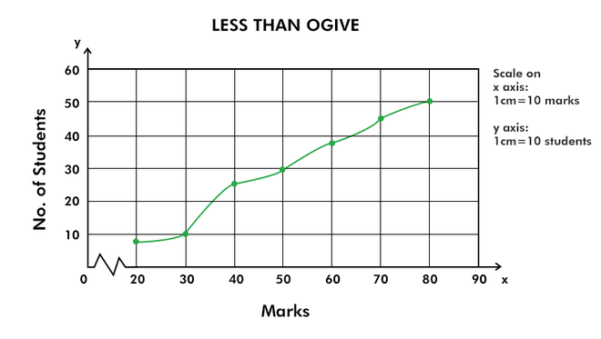 После этого по оси Y отобразите менее кумулятивных частот по отношению к верхнему пределу соответствующего интервала класса по оси X.