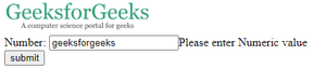 <!DOCTYPE html><html> <head> <script> /* this function is called when we click on the submit button*/ function numberValidation() { /*get the value of the textfield using a combination of name and id*/ //form is the name of the form coded below //numbers are the name of the inputfield /*value is used to fetch the value written in that particular field*/ var n = document.form.numbers.value; /* isNan() function check whether passed variable is number or not*/ if (isNaN(n)) {/*numberText is the ID of span that print "Please enterNumeric value" if the value of inputfield is not a number*/ document.getElementById( "numberText" ).innerHTML = "Please enter Numeric value" ; return false ; } else { /*numberText is the ID of span that print "Numeric value" if the value of inputfield is a number*/ document.getElementById( "numberText" ).innerHTML = "Numeric value is: " + n; return true ; } } </script> </head> <body> <!-- GeeksforGeeks image logo--> <img src= alt= "Avatar" style= "width: 200px;" /> <!-- making the form with form tag than conatins inputField and a button --> <!-- onsubmit calls the numberValidation function which is created above --> <form name= "form" onsubmit= "return numberValidation()" > <!-- name of input type is numbers and create of id of span as numberText--> <!-- Respective output of input is printed in span field --> Number: <input type= "text" name= "numbers" /> <span id= "numberText" ></span> <br /> <input type= "submit" value= "submit" /> </form> </body></html> |