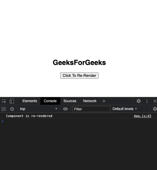 import React from 'react' ; class App extends React.Component { reRender = () => { // calling the forceUpdate() method this .forceUpdate(); }; render() { console.log( 'Component is re-rendered' ); return ( <div> <h2>GeeksForGeeks</h2> <button onClick={ this .reRender}>Click To Re-Render</button> </div> ); }}export App; default |