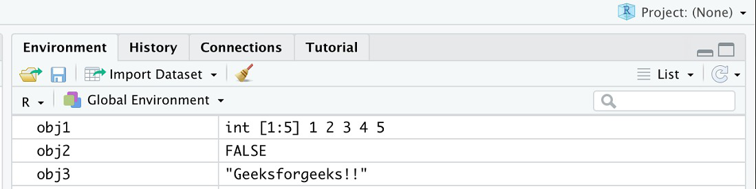 # creating data objectsobj1 <- c(1:5) obj2 <- FALSE obj3 <- "Geeksforgeeks!!" # saving all data to the pathsave(obj1, obj3, file ="tempworkspaceobj.RData")load("tempworkspaceobj.RData") |
