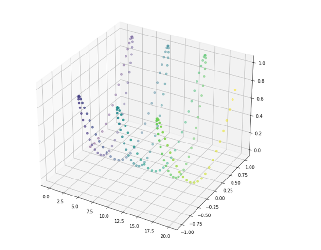 | importnumpy as npimportmatplotlib.pyplot as pltfrommpl_toolkits.mplot3d importAxes3D # Creating array points using numpyx =np.arange(0, 20, 0.1)y =np.sin(x)z =y*np.sin(x)c =x +y #Change the Size of Graph using Figsizefig =plt.figure(figsize =(10, 10)) #Generating a 3D sine waveax =plt.axes(projection ="3d") # To create a scatter graphax.scatter(x, y, z, c =c) # show the graph plt.show() |