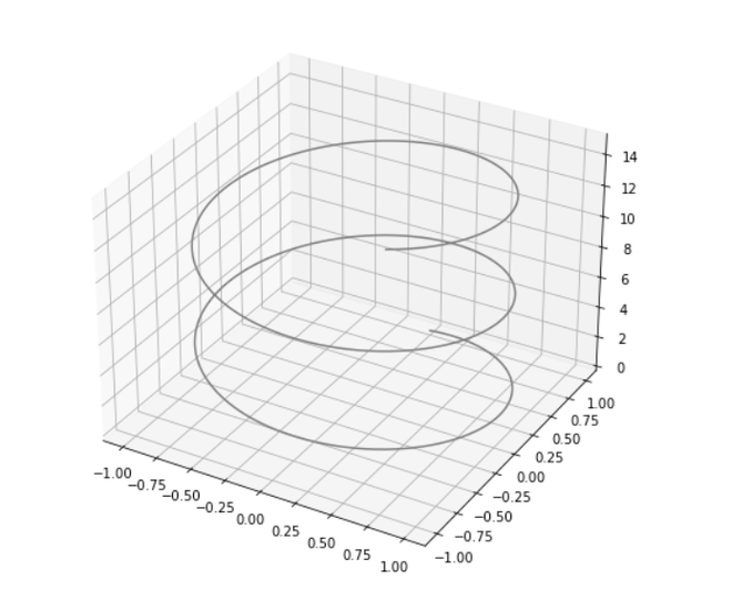 | frommpl_toolkits importmplot3dimportnumpy as npimportmatplotlib.pyplot as plt fig =plt.figure(figsize=(8, 8))ax =plt.axes(projection ="3d") # Creating array points using numpyz =np.linspace(0, 15, 1000)x =np.sin(zline)y =np.cos(zline)ax.plot3D(x, y, z, "gray") plt.show() |