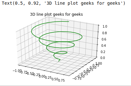 # importing mplot3d toolkits, numpy and matplotlibfrom mpl_toolkits import mplot3dimport numpy as npimport matplotlib.pyplot as plt fig = plt.figure() # syntax for 3-D projectionax = plt.axes(projection ="3d") # defining all 3 axesz = np.linspace(0, 1, 100)x = z * np.sin(25 * z)y = z * np.cos(25 * z) # plottingax.plot3D(x, y, z, "green")ax.set_title("3D line plot geeks for geeks")plt.show() |
