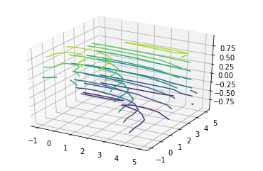 from mpl_toolkits import mplot3dimport numpy as npimport matplotlib.pyplot as plt # function for z axisdef f(x, y): return np.sin(np.sqrt(x ** 2 + y ** 3)) # x and y axisx = np.linspace(-1, 5, 10)y = np.linspace(-1, 5, 10)X, Y = np.meshgrid(x, y)Z = f(X, Y) fig = plt.figure()ax = plt.axes(projection ="3d") # ax.contour3D is used plot a contour graphax.contour3D(X, Y, Z) |