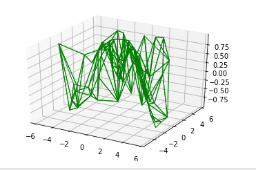 from mpl_toolkits import mplot3dimport numpy as npimport matplotlib.pyplot as plt # angle and radiustheta = 2 * np.pi * np.random.random(100)r = 6 * np.random.random(100) # all three axesx = np.ravel(r * np.sin(theta))y = np.ravel(r * np.cos(theta))z = f(x, y) ax = plt.axes(projection ="3d")ax.scatter(x, y, z, c = z, cmap ="viridis", linewidth = 0.25); ax = plt.axes(projection ="3d")ax.plot_trisurf(x, y, z, cmap ="viridis", edgecolor ="green"); |